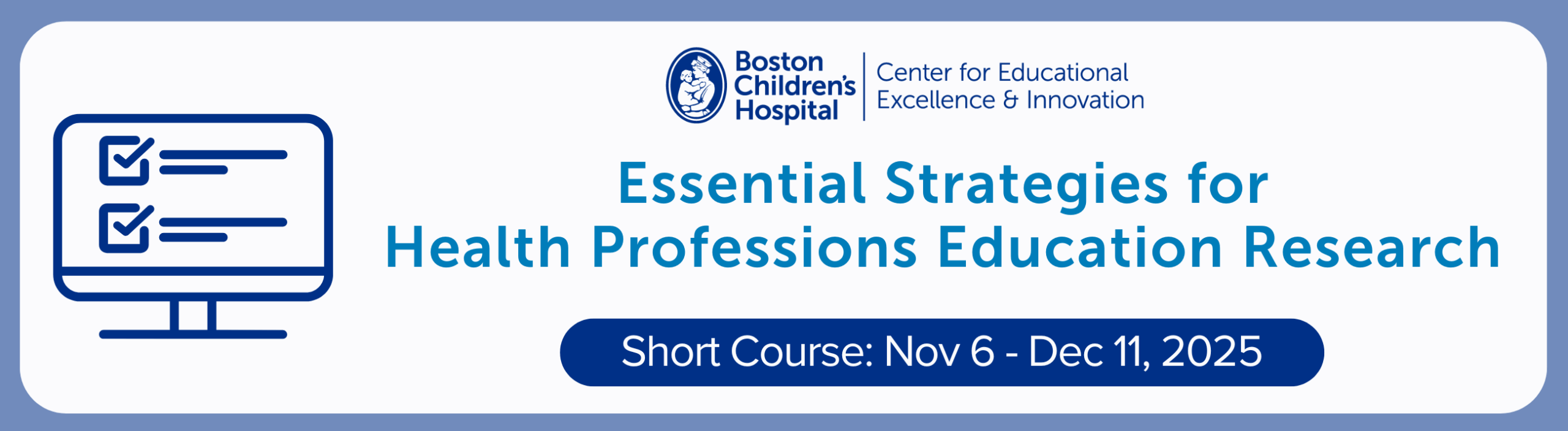 The following Short Courses are part of the forthcoming BCH CEEI Certificate Program in Foundations of Health Professions Education Research. These Short Courses may be taken independently or combined to achieve a Certificate.